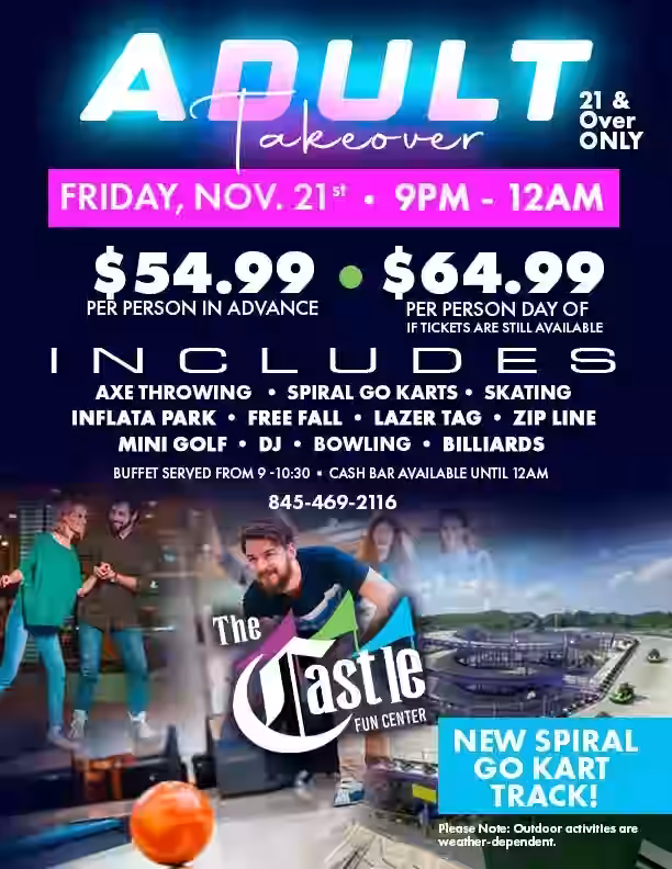 The Castle Fun Center's activities include InflataPark, Ballocity, Roller Skating, Bowling, Dragon Coaster, Zip Line, Rock Climbing, Laser Tag, Arcade, Go Karts, and Mini Golf with Jesters Restaurant and Pub located on the main level of The Castle. Also, The Castle Golf Driving Range & Batting Cages are located just a half mile up the road in Goshen, NY.